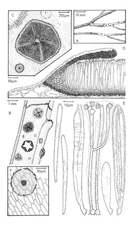 Coccomyces leptideus. A. Habit on twig. B. Ascomata, conidiomata and zone line viewed through a hand lens. C. Ascoma, conidiomata and zone line viewed with a dissecting microscope. D. Ascoma in vertical transverse section. E. Asci, ascospores and paraphyses. F. Conidioma in horizontal section.