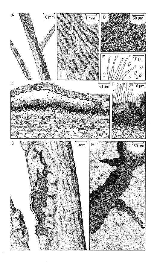 Cryptomyces maximus. A. Habit on twig. B. Conidiomatal surface viewed through a hand lens. C. Conidioma in vertical transverse section. D. Detail of conidiomatal upper wall in horizontal section, viewed with a compound microscope. E. Conidia and conidiogenous cells. F. Detail of lower part of conidioma in vertical transverse section. G. Ascomata viewed through a hand lens. H. Part of ascoma viewed with a dissecting microscope.