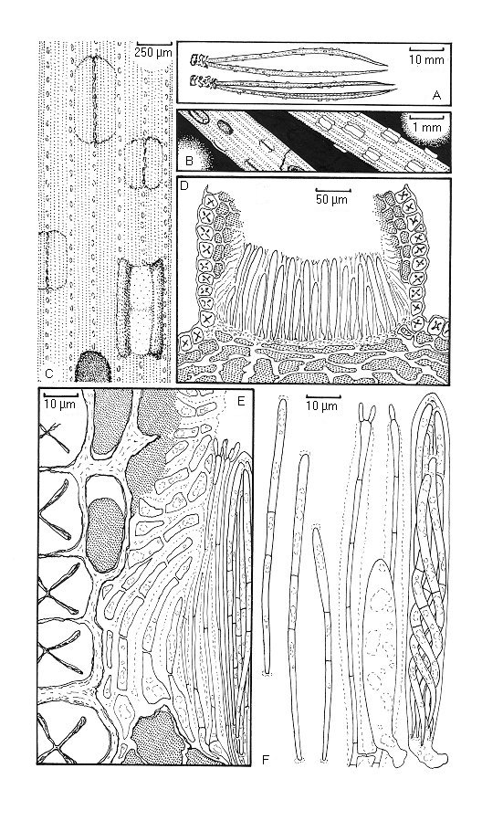 Cyclaneusma minus. A. Habit on needles. B. Ascomata viewed through a hand lens. C. Ascomata viewed with a dissecting microscope. D. Ascoma in vertical transverse section. E. Detail of side of ascoma in vertical transverse section. F. Asci, ascospores and paraphyses.