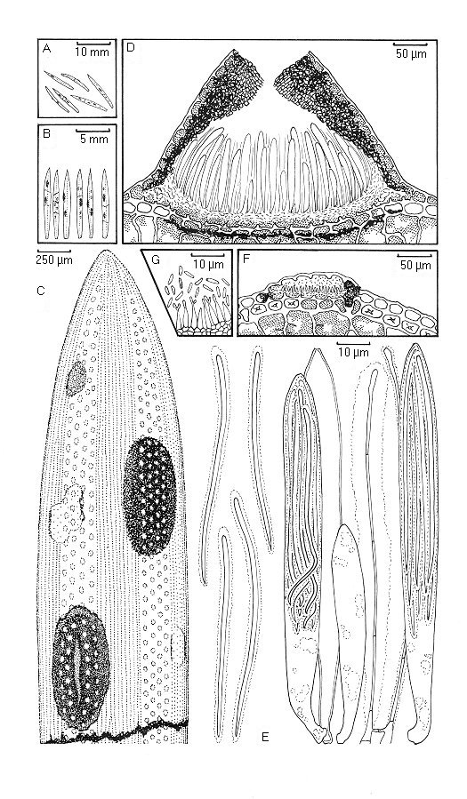 Lophodermium abietis. A. Habit on needles. B. Ascomata, conidiomata and zone lines viewed through a low power hand lens. C. Ascomata, conidiomata and zone line viewed with a dissecting microscope. D. Ascoma in vertical transverse section. E. Asci, ascospores and paraphyses. F. Conidioma in vertical transverse section. G. Conidiogenous cells and conidia.