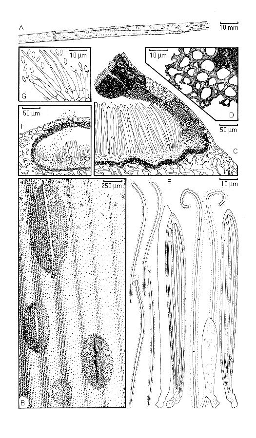 Lophodermium arundinaceum. A. Habit on stem and leaf sheath. B. Ascomata viewed with a dissecting microscope. C. Ascoma in vertical transverse section. D. Detail of heavily blackened upper wall in vertical transverse section. E. Asci, ascospores and paraphyses. F. Conidioma in vertical transverse section. G. Conidiogenous cells and conidia.