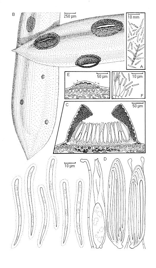 Lophodermium juniperinum. A. Habit on needles. B. Ascomata and conidiomata viewed with a dissecting microscope. C. Ascoma in vertical transverse section. D. Asci, ascospores and paraphyses. E. Conidioma in vertical transverse section. F. Conidiogenous cells and conidia.