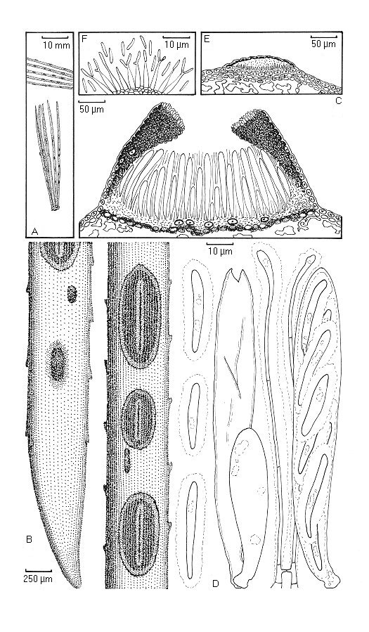Meloderma desmazieresii. A. Habit on needles. B. Ascomata and conidiomata viewed with a dissecting microscope. C. Ascoma in vertical transverse section. D. Asci, ascospores and paraphyses. E. Conidioma in vertical transverse section. F. Conidiogenous cells and conidia.