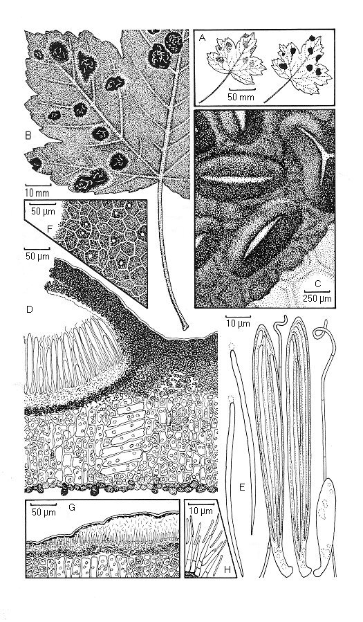 Rhytisma acerinum. A. Leaves with young (left) and older blackened (right) stromata in field conditions. B. Habit on leaf. C. Part of stroma with ascomata viewed with a dissecting microscope. D. Part of stroma and ascoma in vertical transverse section. E. Asci, ascospores and paraphyses. F. Part of conidioma in vertical transverse section. G. Detail of conidiomatal upper wall in horizontal section. H. Conidiogenous cells and conidia.