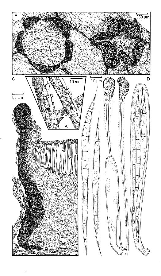 . A. Habit on twig. B. Ascomata viewed with a dissecting microscope. C. Ascoma in vertical transverse section. D. Asci, ascospores and paraphyses.