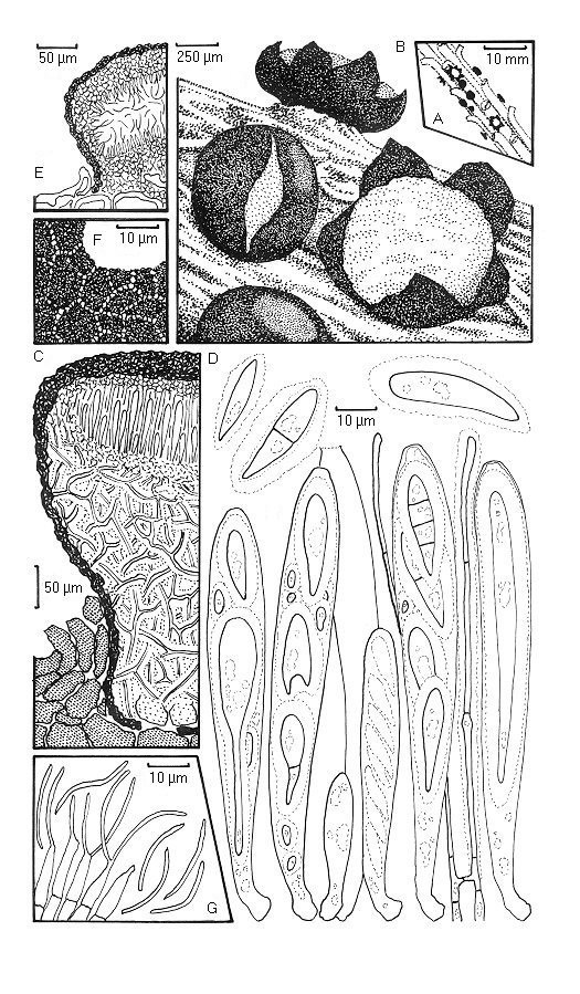 Tryblidiopsis pinastri. A. Habit on twig. B. Ascomata viewed with a dissecting microscope. C. Ascoma in vertical transverse section. D. Detail of ascomatal upper wall in horizontal section showing plate-like pattern. E. Asci, ascospores and paraphyses; most of the ascospores illustrated are atypical and probably the result of the in vitro maturation to which the illustrated specimen was subjected; the two free ascospores in the top left hand part of the illustration are typical of those observed in fresh naturally matured specimens. F. Conidioma in vertical transverse section. G. Conidiogenous cells and conidia.