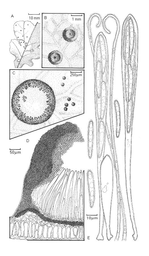 . A. Habit on leaf. B. Ascomata viewed through a hand lens. C. Ascoma viewed with a dissecting microscope. D. Ascoma in vertical transverse section. E. Asci, ascospores and paraphyses.