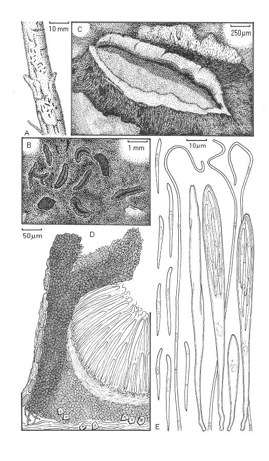 . A. Habit on twig. B. Ascomata viewed through a hand lens. C. Ascoma viewed with a dissecting microscope. D. Ascoma in vertical transverse section. E. Asci, ascospores and paraphyses.