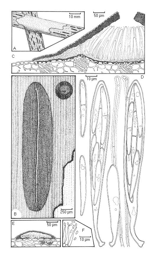 Hypohelion scirpinum. A. Habit on stem. B. Ascoma, conidiona and zone lines viewed with a dissecting microscope. C. Ascoma in vertical transverse section. D. Ascus, ascospores and paraphyses. E. Conidioma in vertical transverse section. F. Conidiogenous cells and conidia.